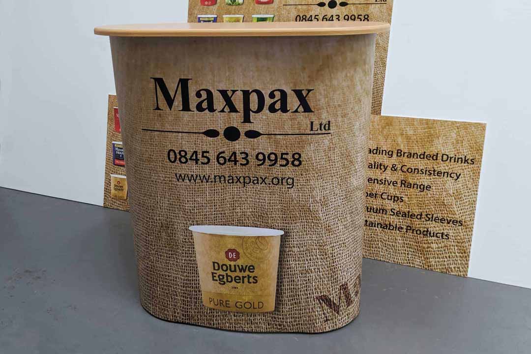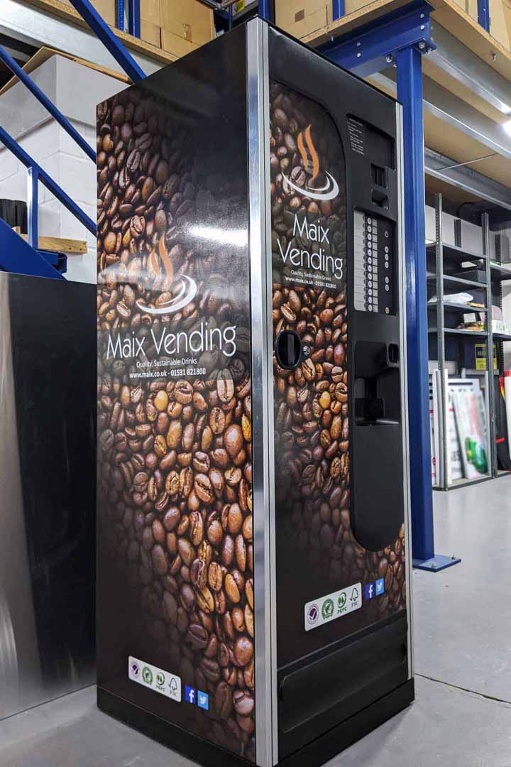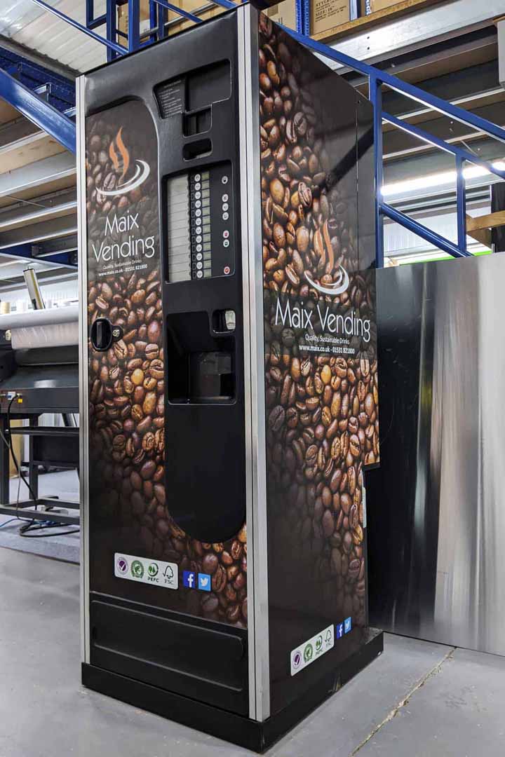 The print media used was all Oracal 3651, printed on our Roland EJ640, with the matching 215 gloss or matt laminate and the cut text is Oracal 751. The exhibition stand pop up counter table was supplied through our online shop – please see here for more information. The front stickers on the coffee vending machines were created by templating the original versions, creating the new print file with the Maix Vending design, then die cutting the printed vinyl with our Summa vinyl cutter. This means that we can supply sticker sets to the customer (if necessary) without any difficult fitting or cutting needed when they are applied.