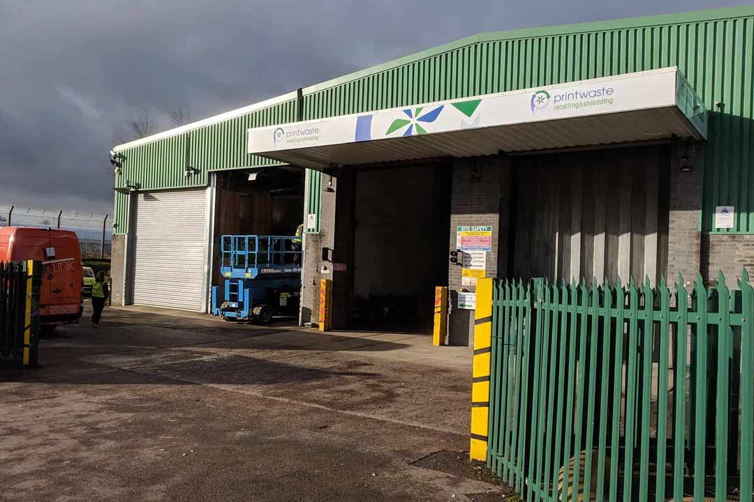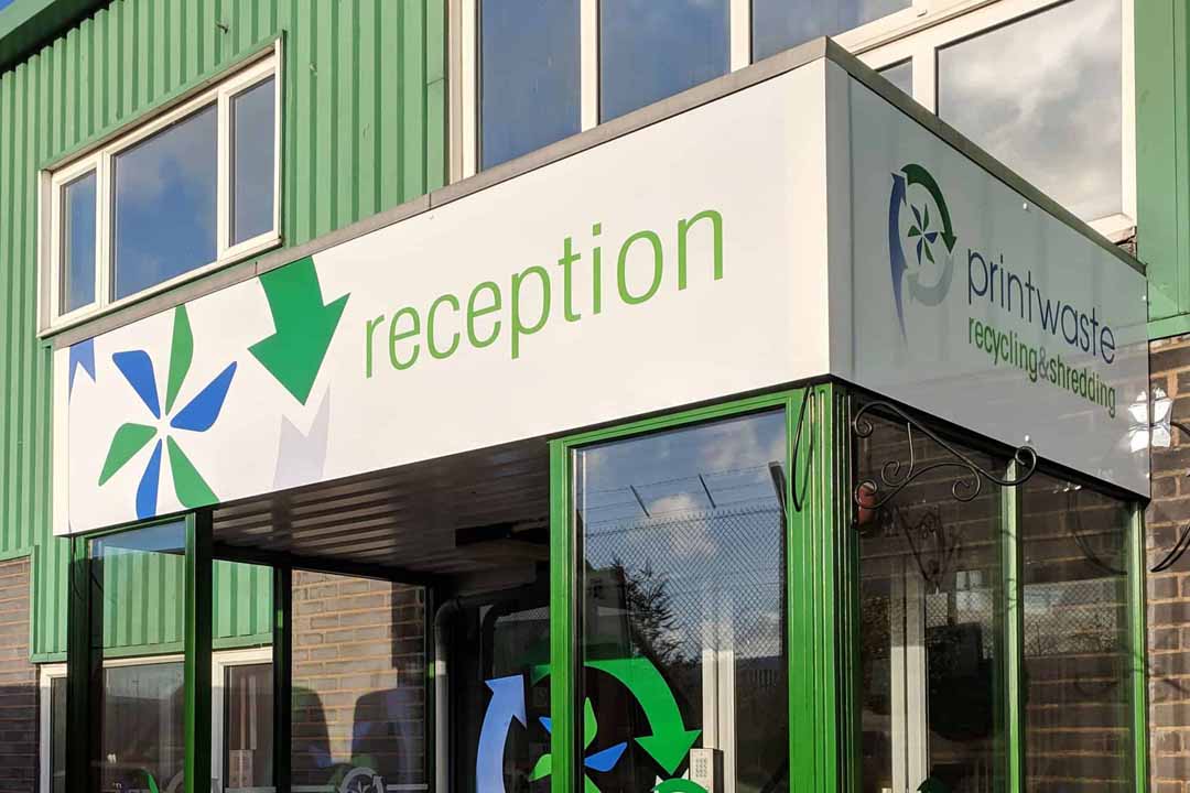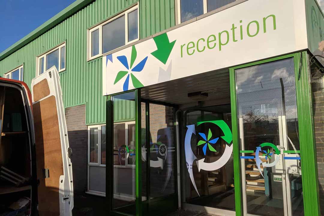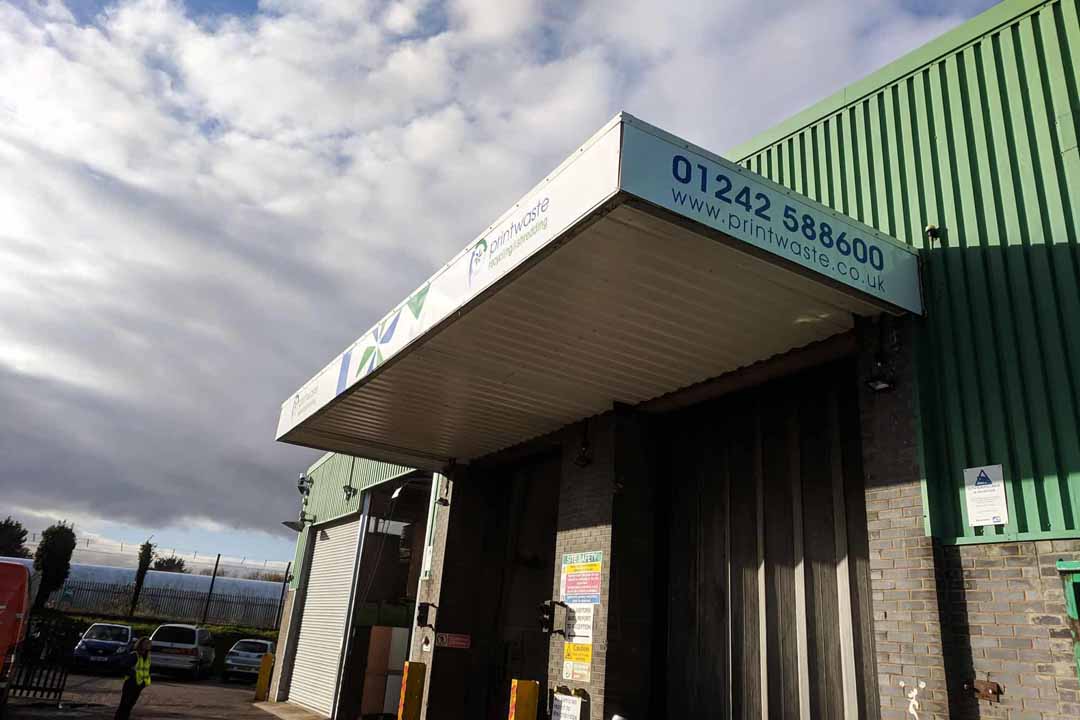 Long term customers Printwaste, a large commercial waste recycling company in Gloucestershire, asked us to renew the signs in their Cheltenham depot on Tewkesbury Road. The old signage had been fitted by us around 10 years ago and still worked perfectly, however the company logo had been updated. We replaced the loading bay canopy signage panels, the reception porch panels and applied new window graphics to the entrance doors.